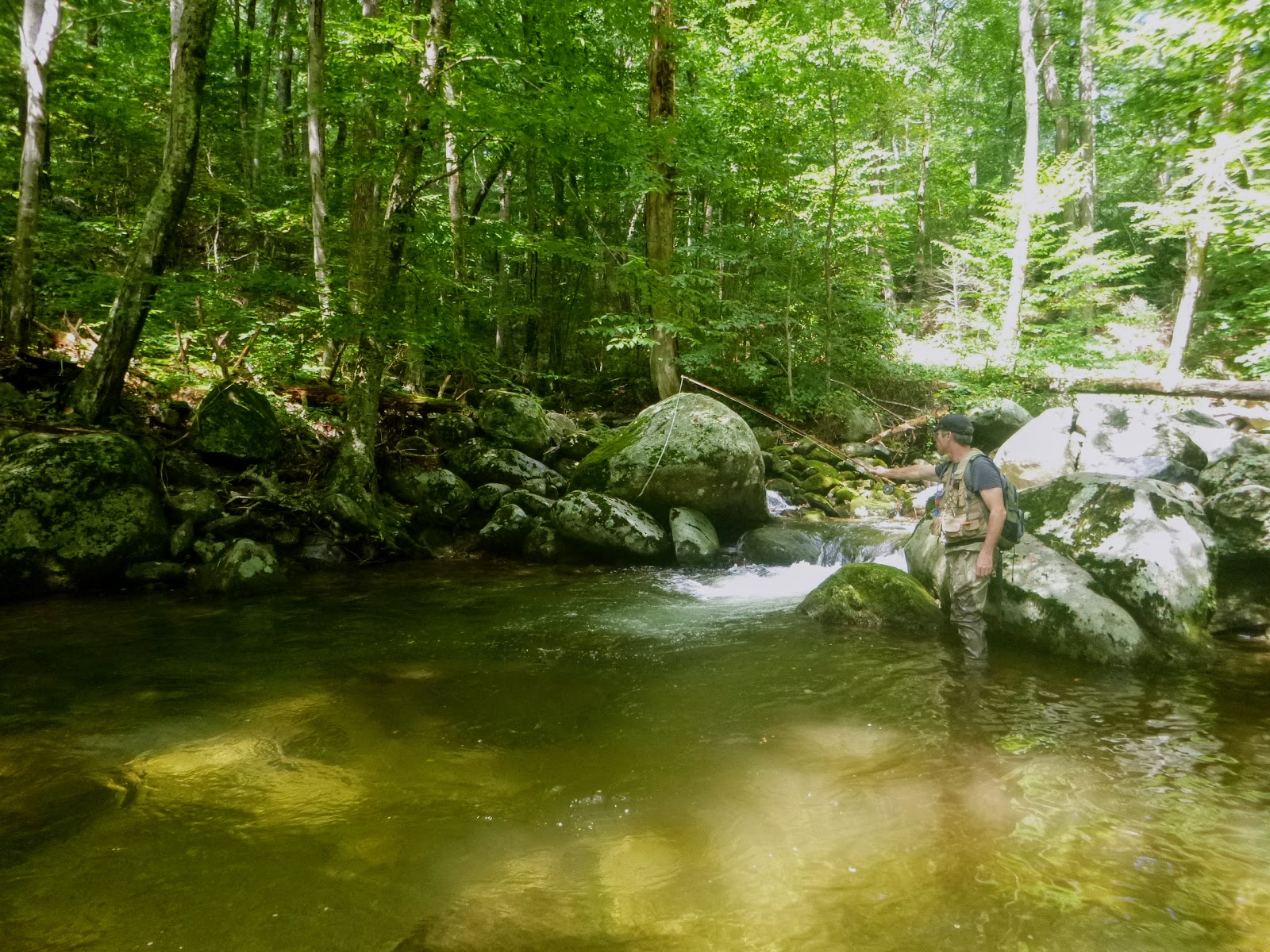 Sometimes half the fun of fishing is the adventure of getting there. We trekked for about an hour before hopping into the creek. The water was as crystal clear as any water you would ever find. It was now "hopper time!"